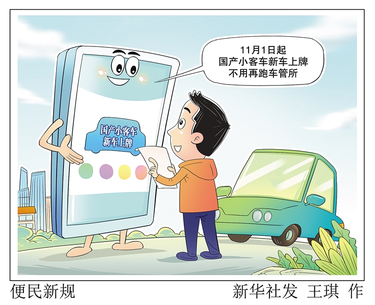 下月起,國產小客車新車上牌不用再跑車管所!國產小客車新車上牌“一件事”服務11月1日起在全國全面推行,全面推進買車、購險、繳稅、上牌等“信息聯動、一站辦結”,群眾辦事時間將從線下2個多小時壓縮至線上半小時內。新華社發 王琪 作