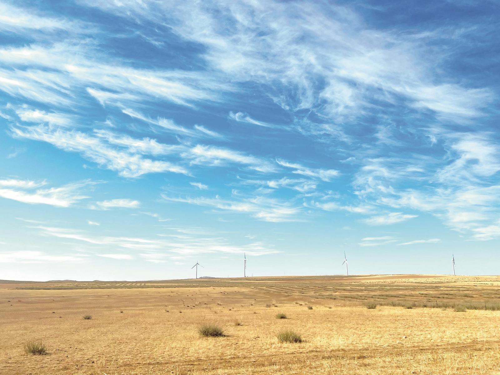 10月30日,達茂旗草原鋪展成金色畫卷。遼闊的曠野間,牧草裹著暖陽泛著柔光,成片風力發電機葉片緩緩轉動,勾勒出草原的別樣風光。 (李強)