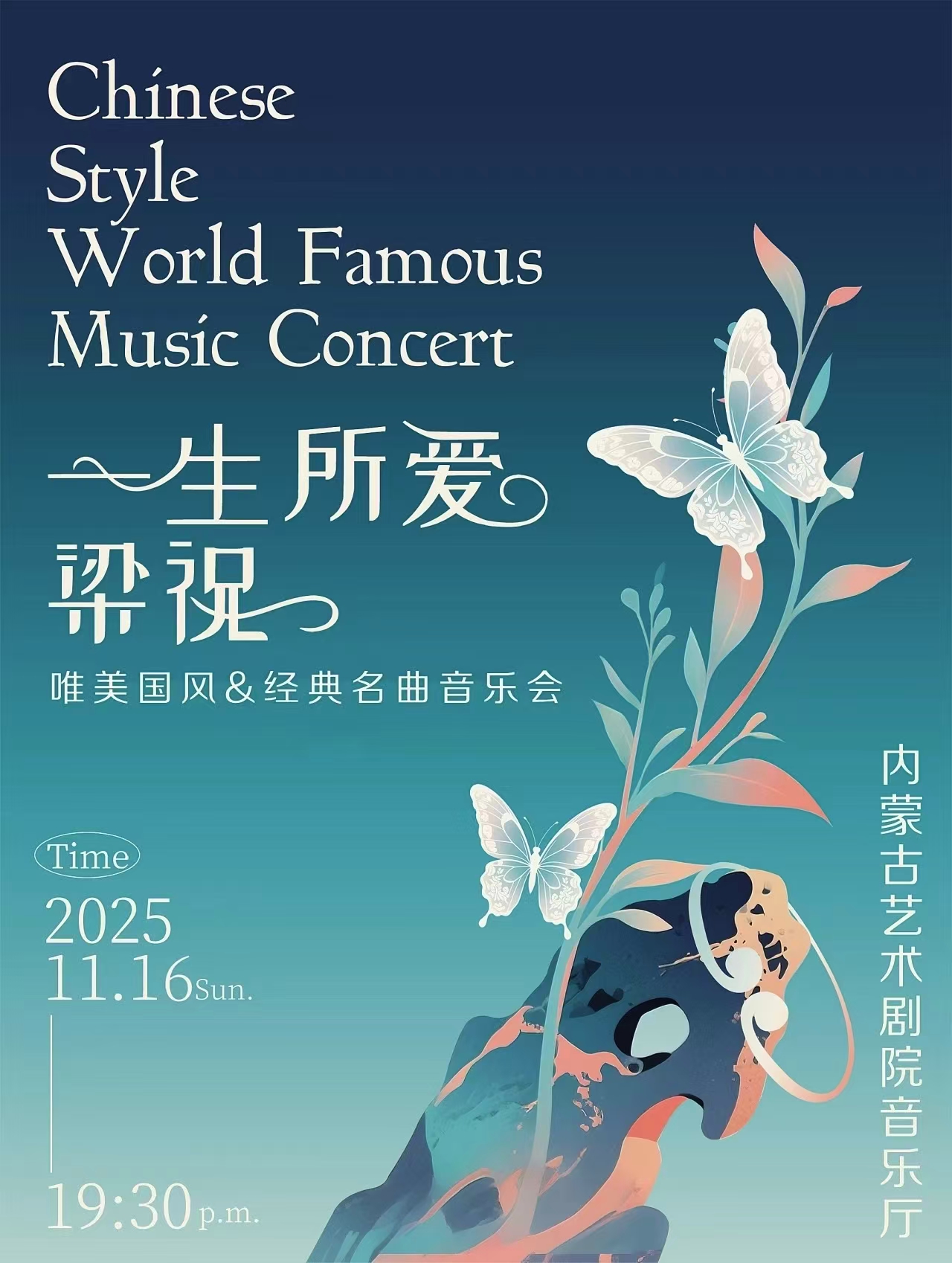 《一生所愛》《梁?!肺绹L&經典名曲音樂會:11月16日(周日)19:30,內蒙古藝術劇院音樂廳