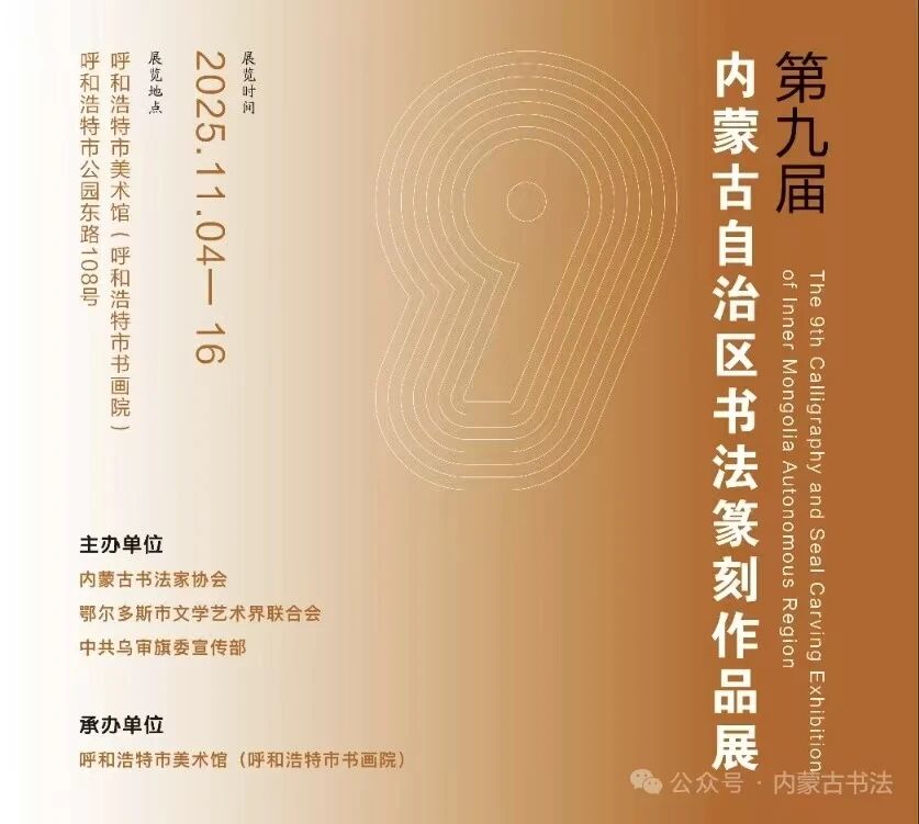 第九屆內蒙古自治區書法篆刻作品展(呼和浩特站):11月4日—11月16日,呼和浩特市美術館(呼和浩特市書畫院)