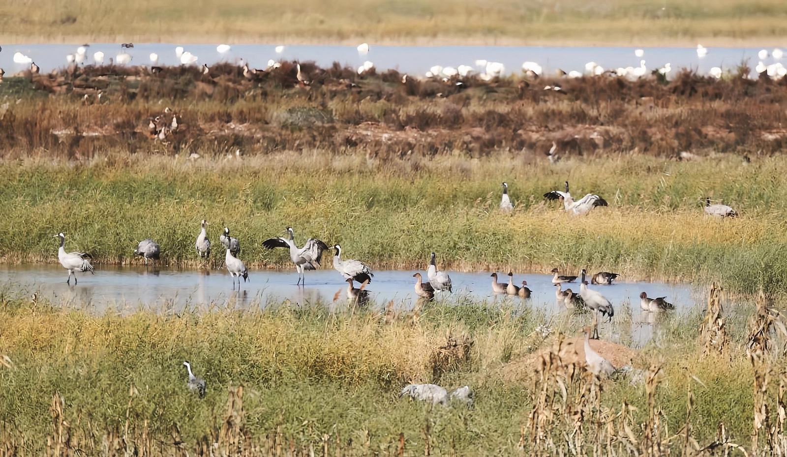 國家二級保護動物灰鶴及“三有”保護動物豆雁在濕地中翩躚起舞。(圖片由市林草資源保護站提供)