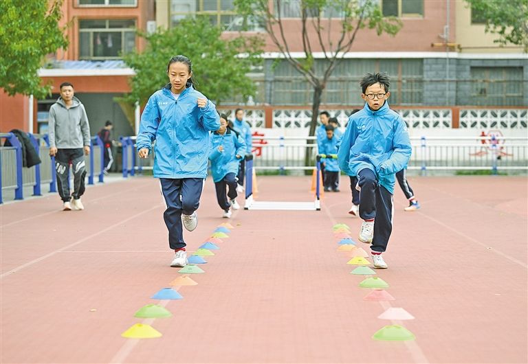 學生們在體育課上練習跑步。