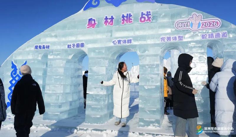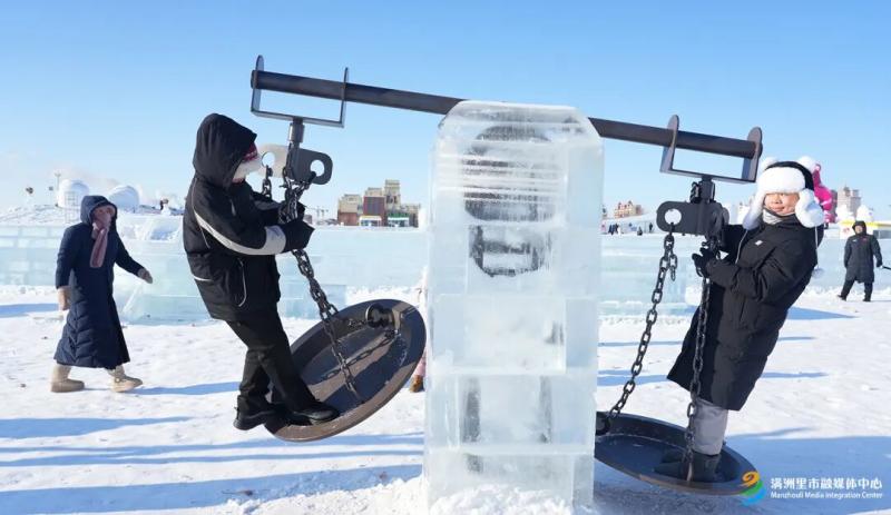 《冰雪芳華》主題樂園內,炫彩音樂噴泉冰柱互動裝置堪稱是人氣爆棚的“冰雪互動體驗地”,大人小孩都能在這里解鎖冬日獨有的歡樂。該景觀是以手風琴和鋼琴為核心造型,結合冰墻形成互動式的景觀,不僅好看而且好玩,還寓意著中俄蒙國際冰雪節在滿洲里奏響睦鄰友好的優美樂章。樂園內,像這樣互動式的冰雪景觀還有很多,極具口岸特色的滿洲里火車頭景觀引得市民紛紛駐足。“這里節日氛圍特別濃,特別能感受到冰雪文化的魅力。這個火車頭特別有意義,既能彰顯滿洲里絲綢之路節點地位,又凸顯出滿洲里是北疆最大陸路口岸的特點。我們在很多的冰雪建筑前都打卡拍照了,感覺咱們這兒也自成一個冰雪大世界,十分歡迎全國各地的朋友來滿洲里打卡。”李佳琦和兩位好友結伴暢游,并對記者分享了自己的感受。