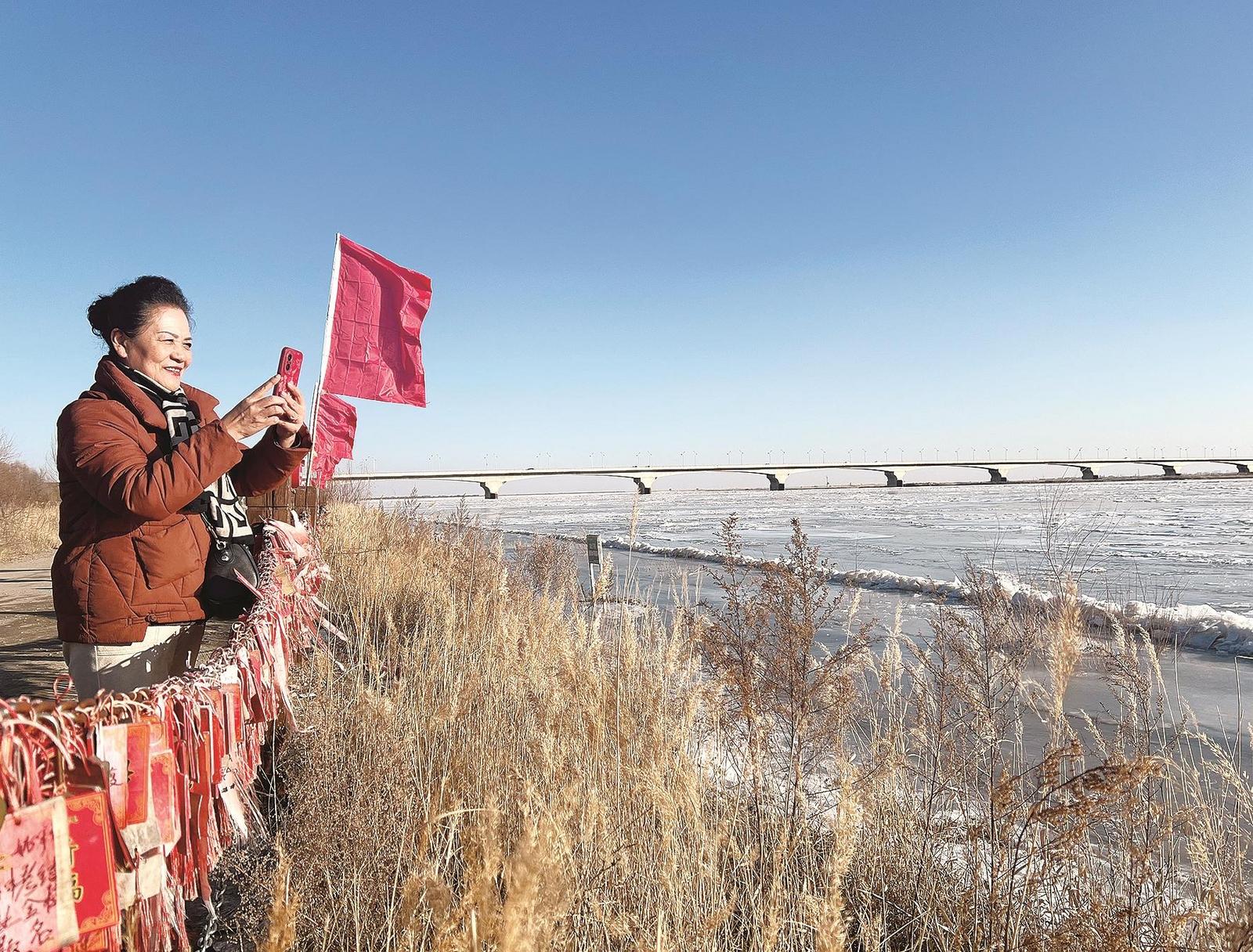 “黃河之水天上來,冬日冰封似玉裁”。12月28日,黃河包頭段的冰封之景,宛如一幅雄渾的水墨畫卷。層層疊疊的冰凌在陽光下閃耀,引得游客紛至沓來,用鏡頭定格這壯觀的冬日詩章。 (李強)