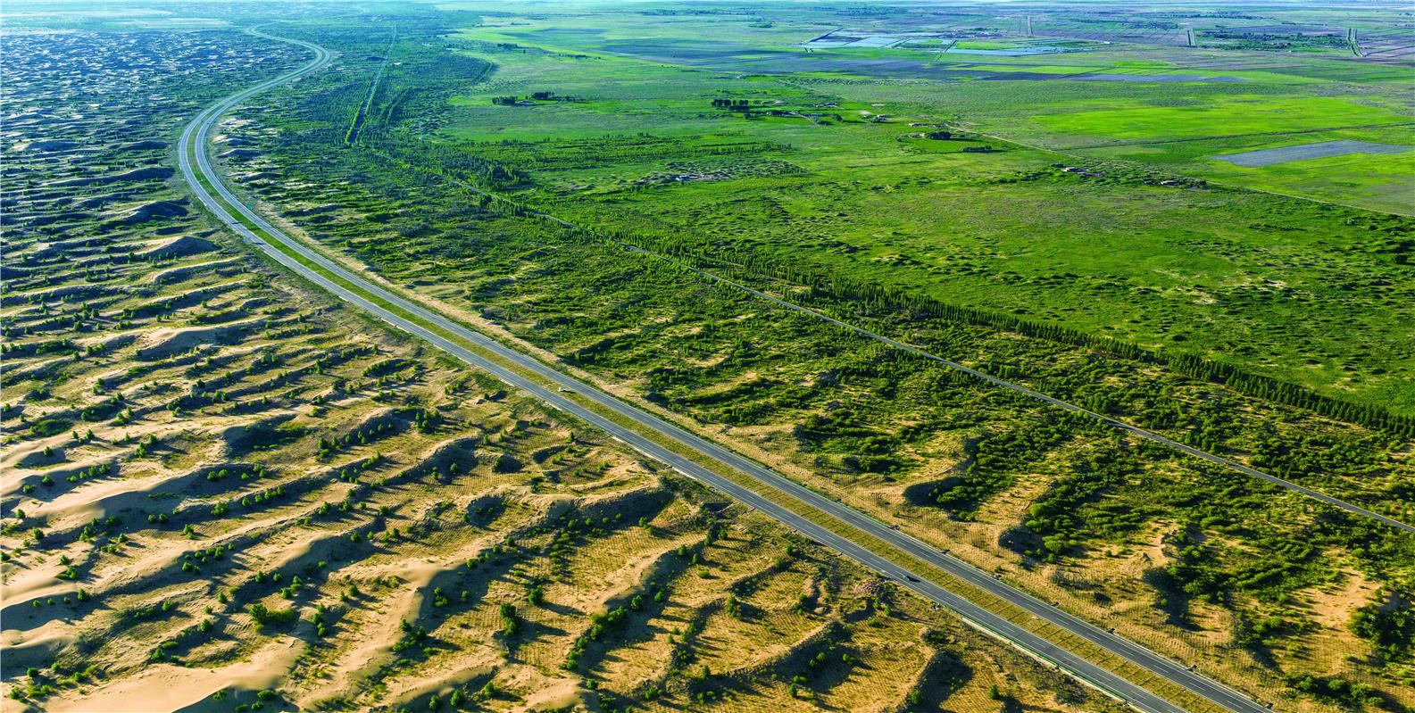 據介紹,在黃河“幾字彎”攻堅戰區,黃河兩岸620公里防護林草帶全線貫通,“綠色圍欄”加快筑起;在科爾沁、渾善達克兩大沙地殲滅戰區,9個旗縣流動沙地全部殲滅,新建穿沙公路2528公里、鎖住流沙464萬畝,科爾沁沙地重現草原風光;在河西走廊—塔克拉瑪干沙漠邊緣阻擊戰區,建設巴丹吉林、騰格里沙漠鎖邊林草帶336.8公里,河西走廊“防風阻沙墻”更加厚實。